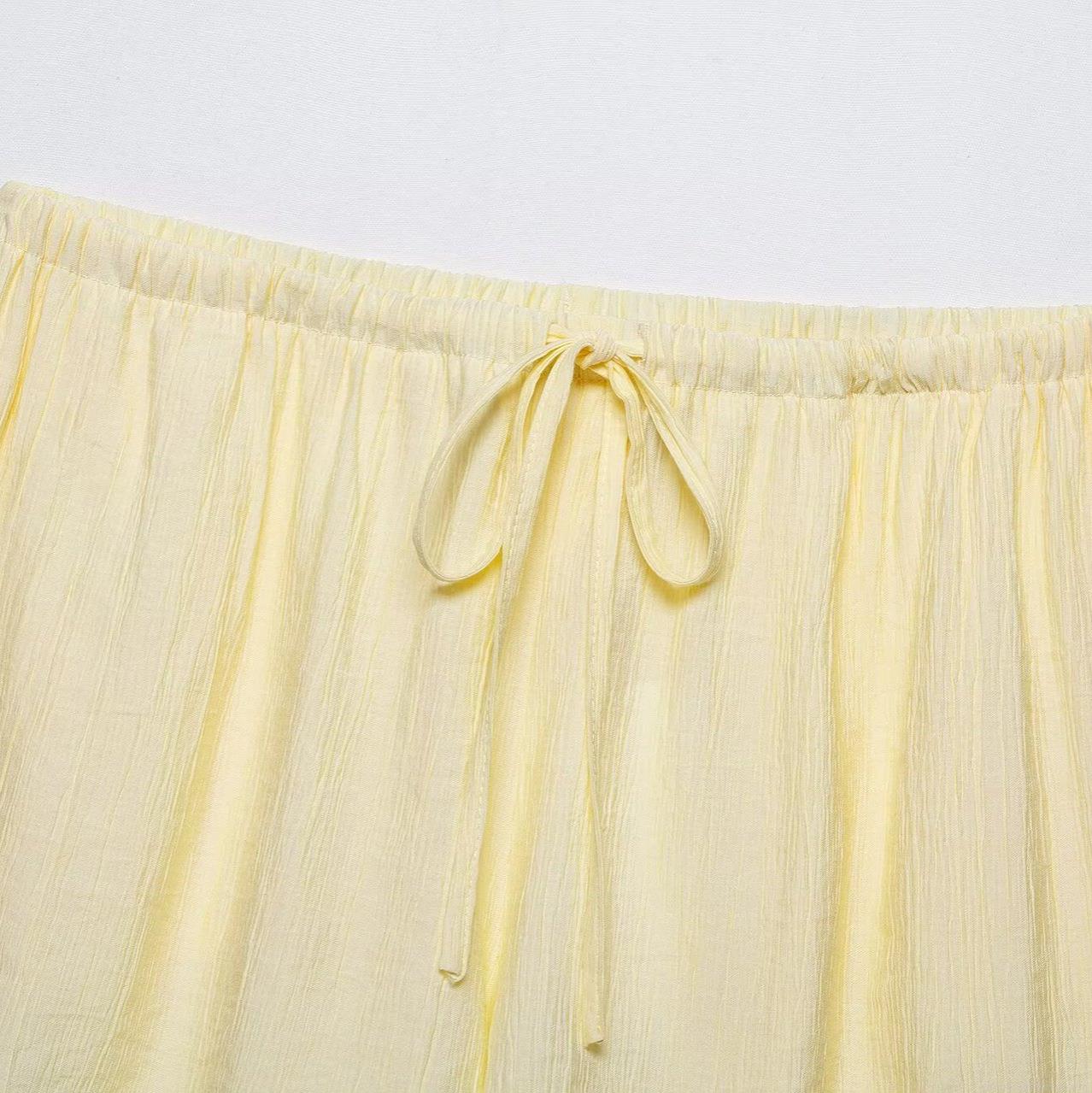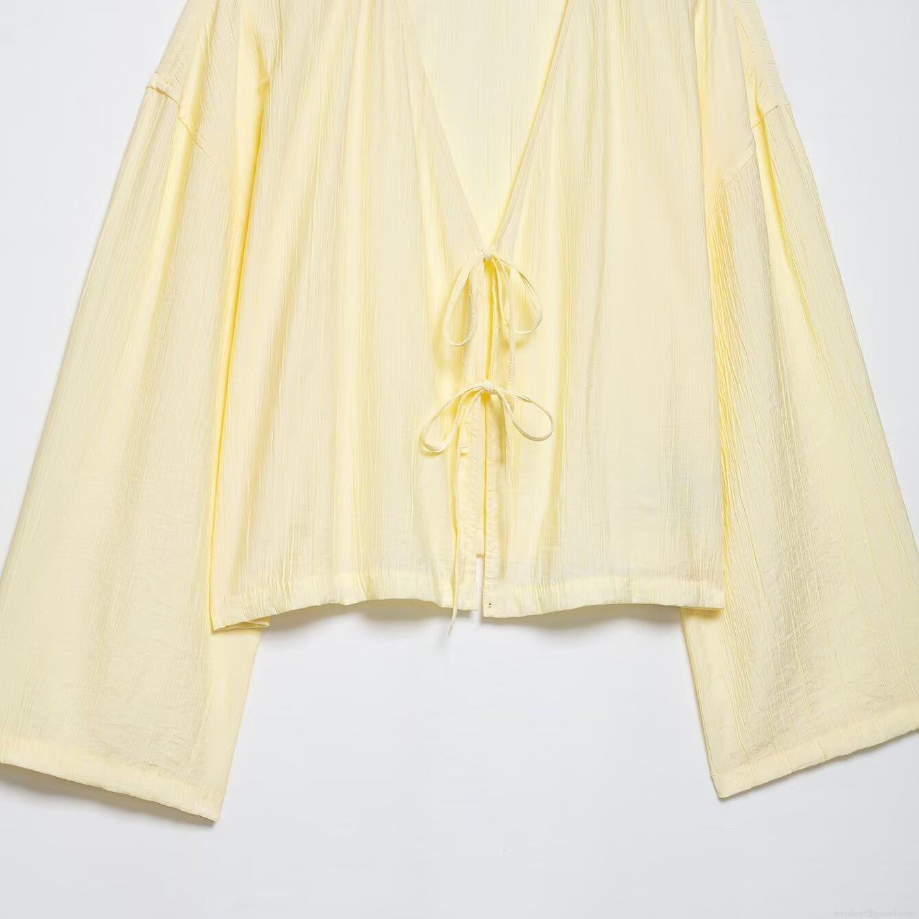 Solid Color, Bow, V-neck, Lace-up Design, Wrinkled Texture