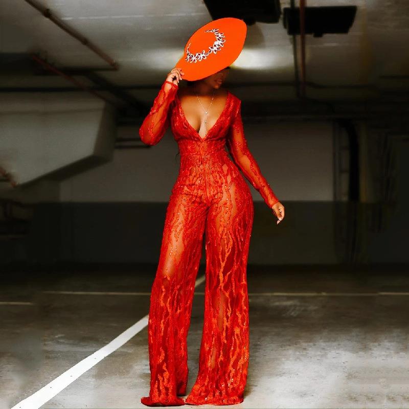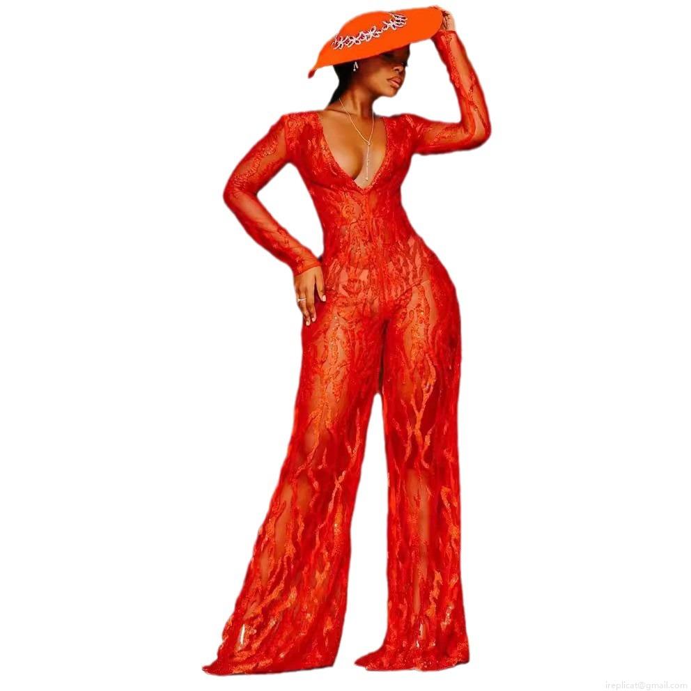 Solid Color, Lace, Sequin, Hollow Out, Wide-leg, Deep V
