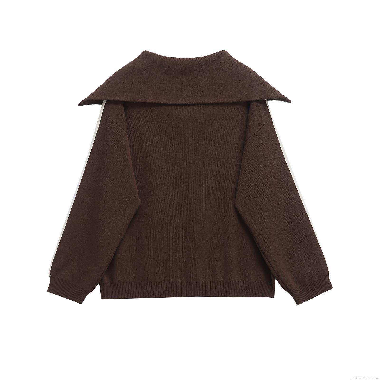 Solid Color, Half Zipper, Color-blocked Stripes, Wide-leg, Large Lapel, Side Stripes