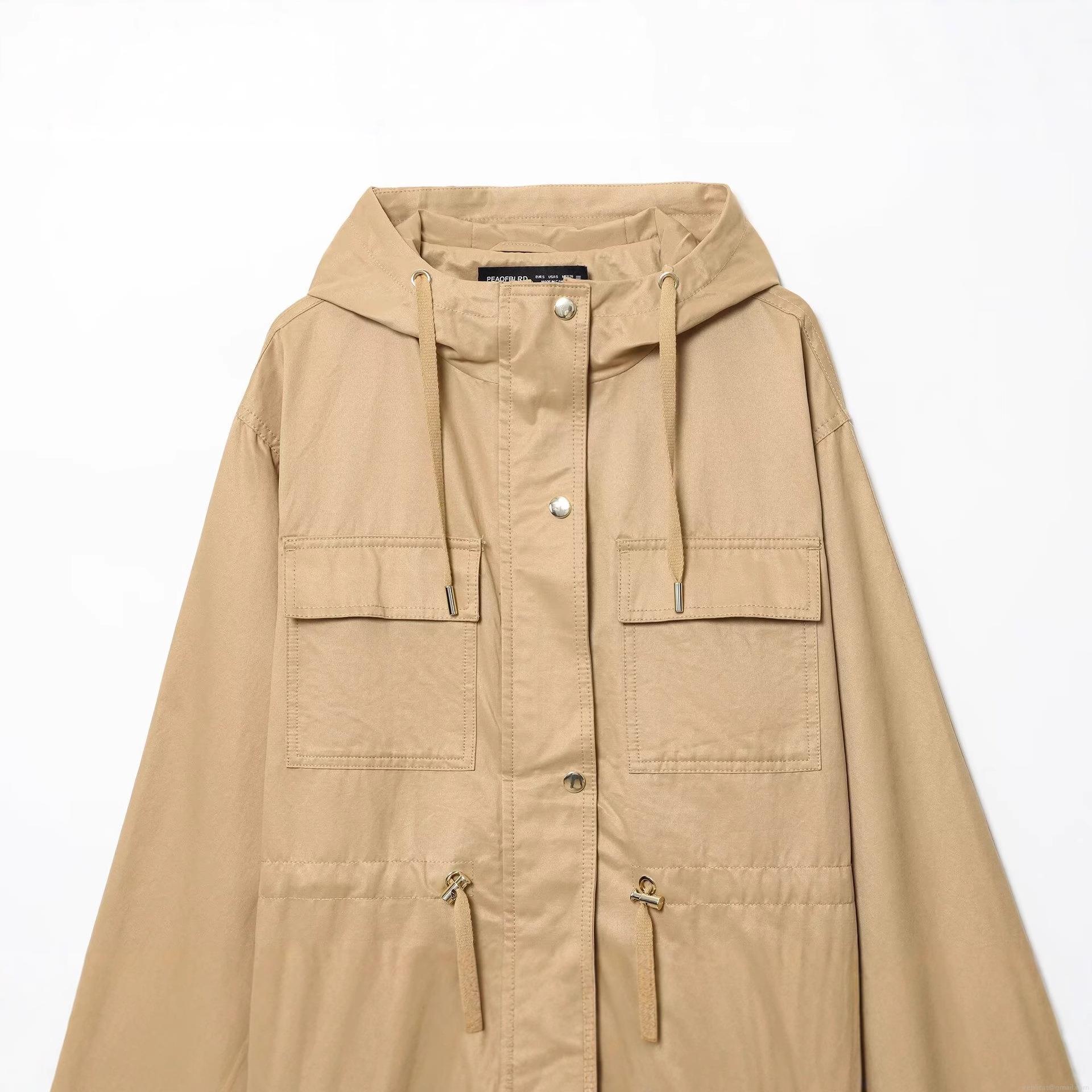 Solid Color, Drawstring, Hood, Metal Snap, Flap Pocket