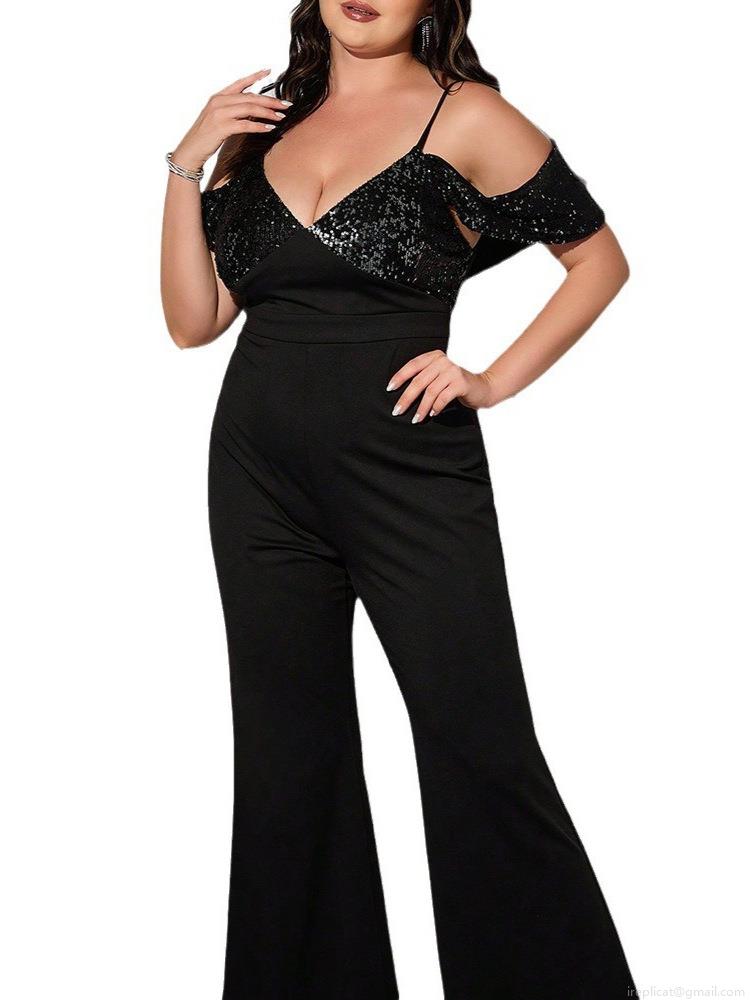 Splice, Sequin, V-neck, Off-shoulder, Flared Pants, Sequin Splicing