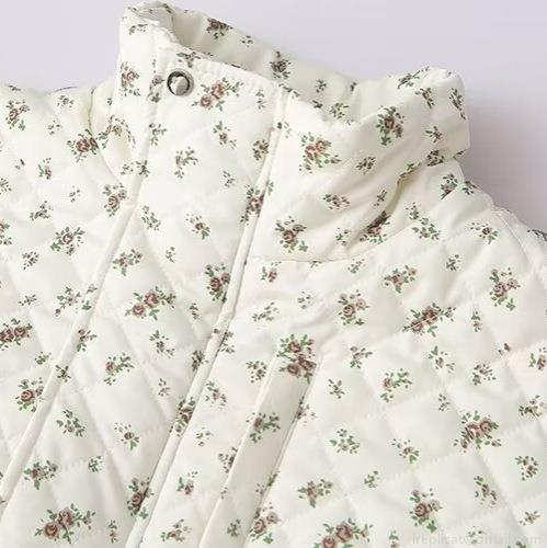 Floral Pattern, Metal Buckle, Stand-up Collar, Floral Print, Diamond Quilting