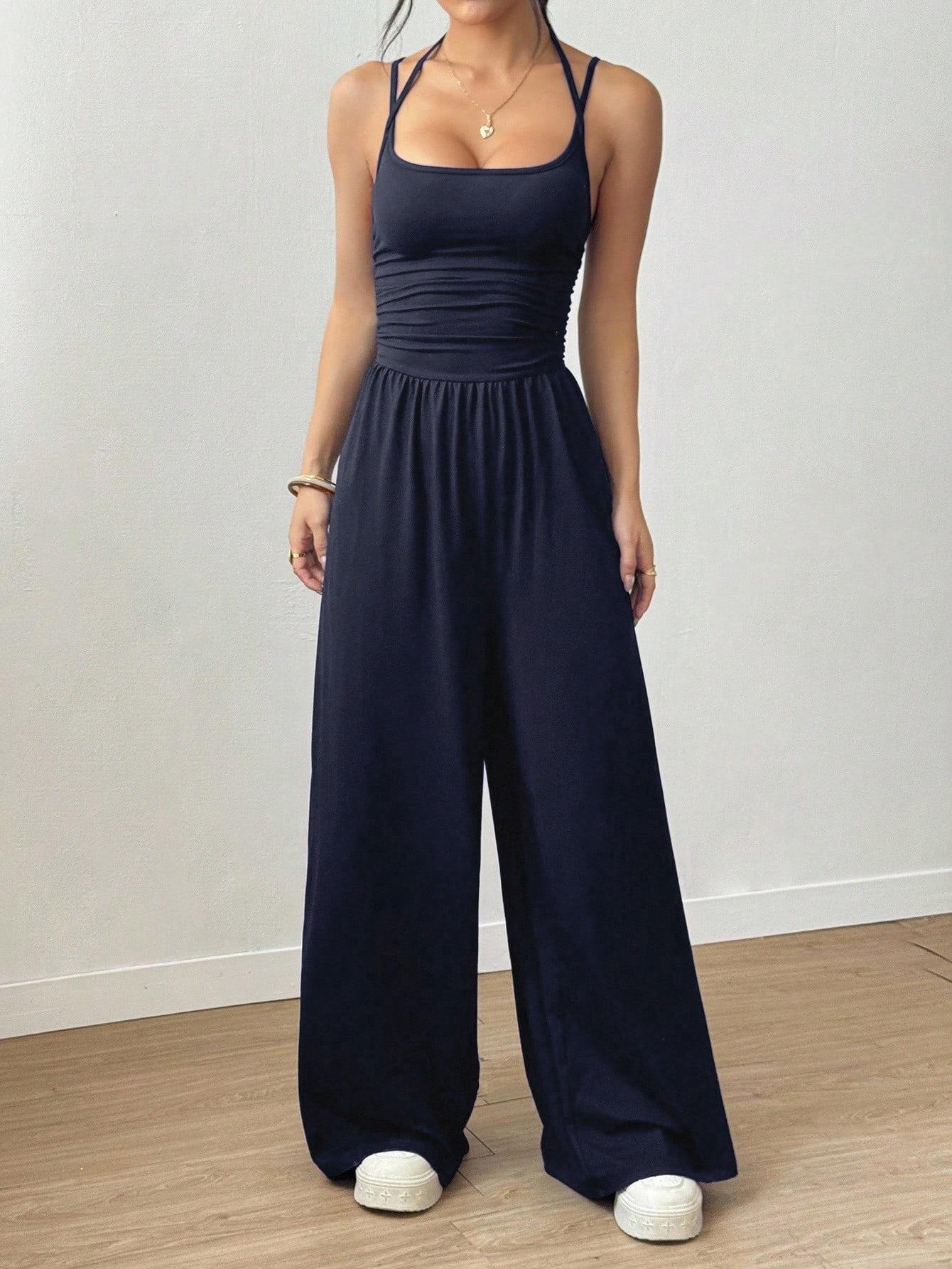 Solid Color, Backless, Wide-leg Pants, Pleated Decoration, Neckband Design, High-waisted And Slimming