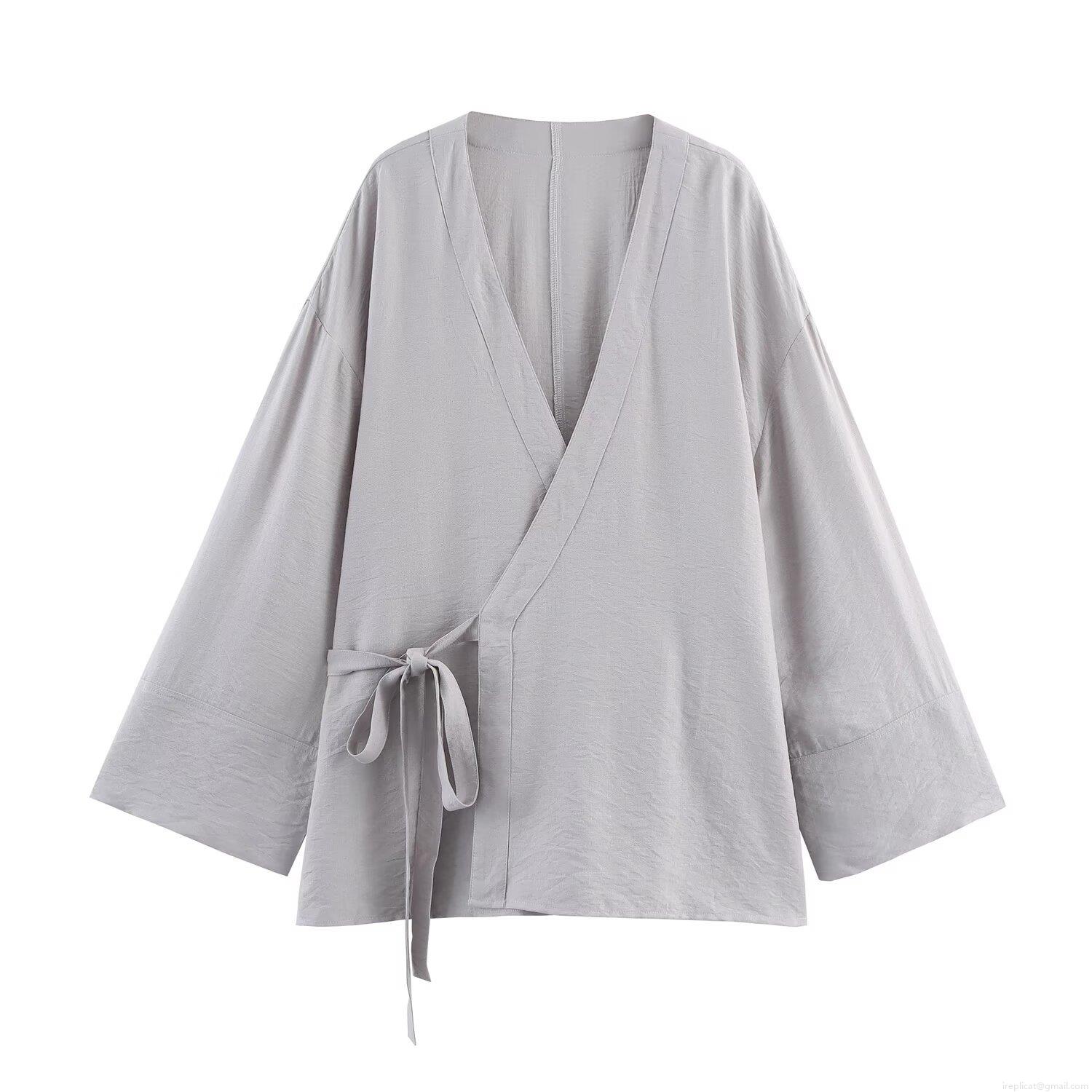 Solid Color, Elastic Waistband, Wide-leg, Ribbon Bow, Wrap-up, Kimono-style Cross Collar