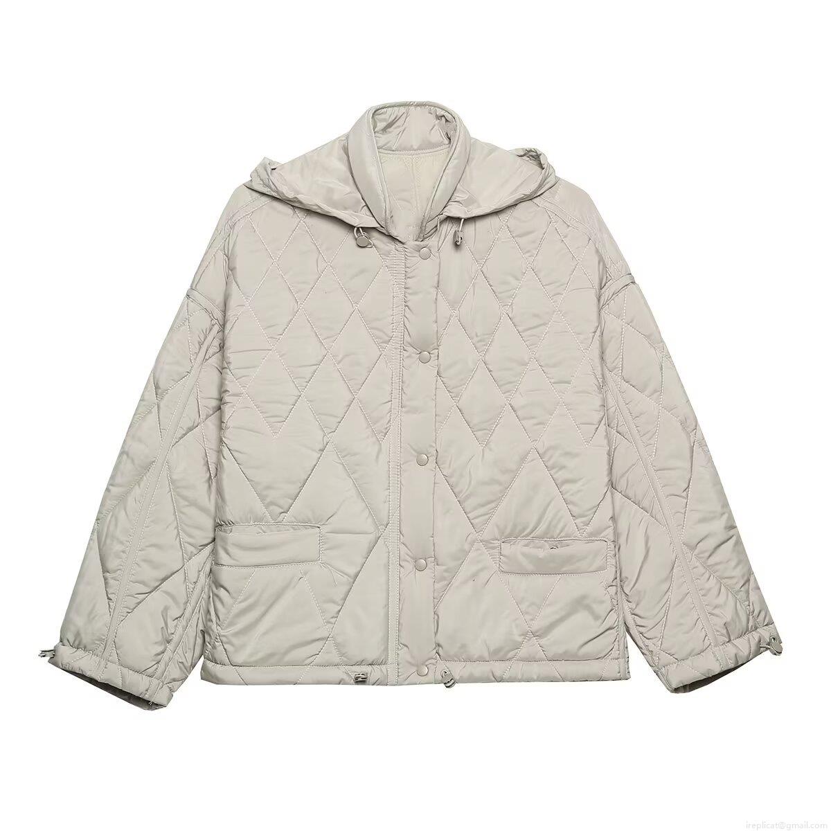 Solid Color, Zipper, Diamond Pattern, Metal Snap, Diamond Quilting, Drawstring At The Hem, Stand-up Collar Hood