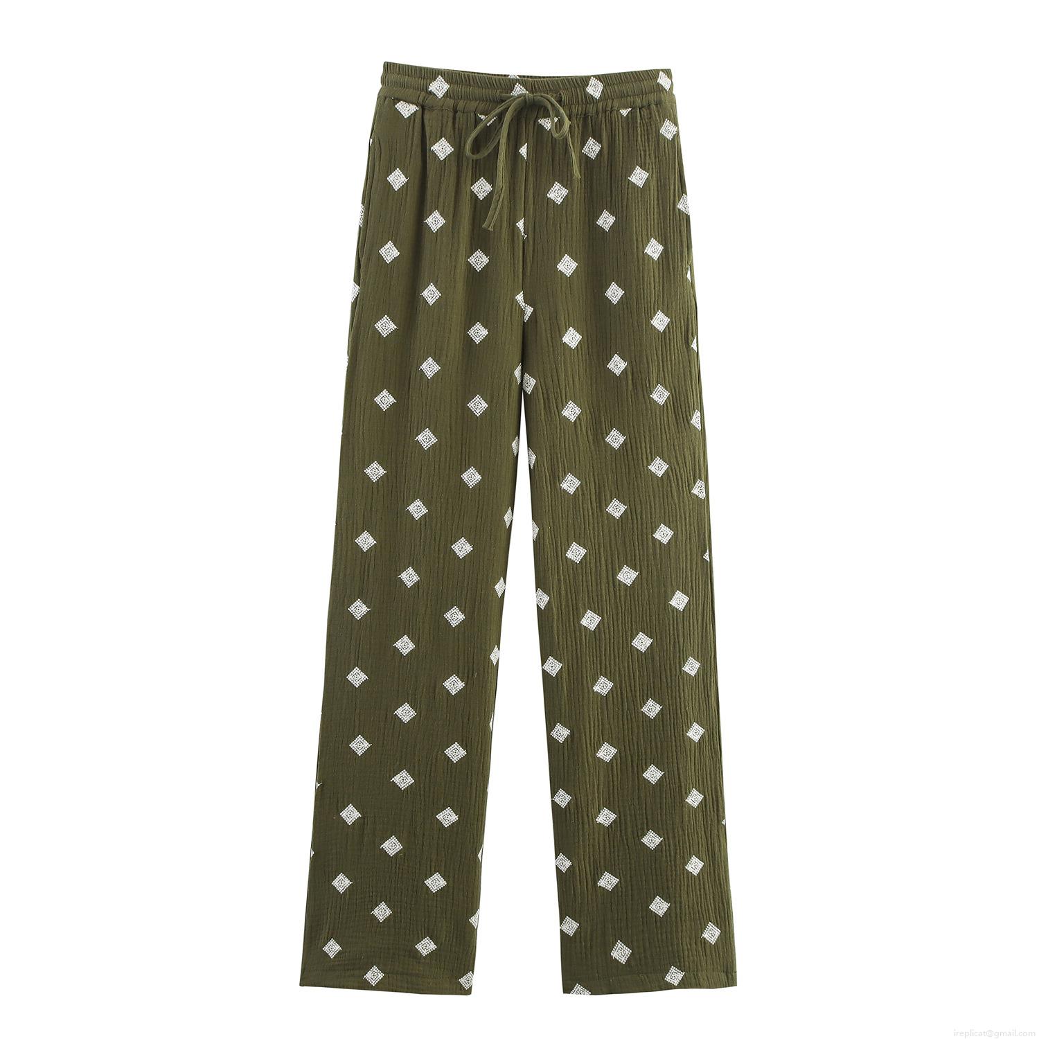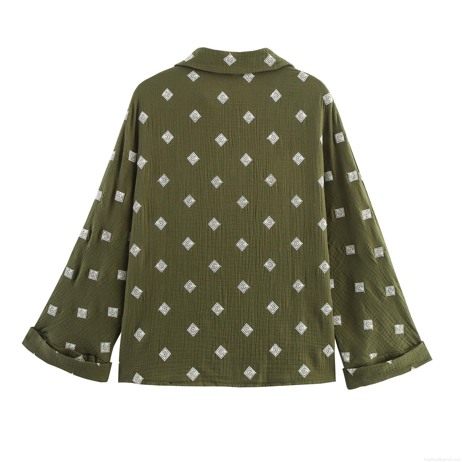 Embroidery, Small White Floral Pattern, Geometric Rhombus, Drawstring, Lapel, Button, Wrinkled Texture