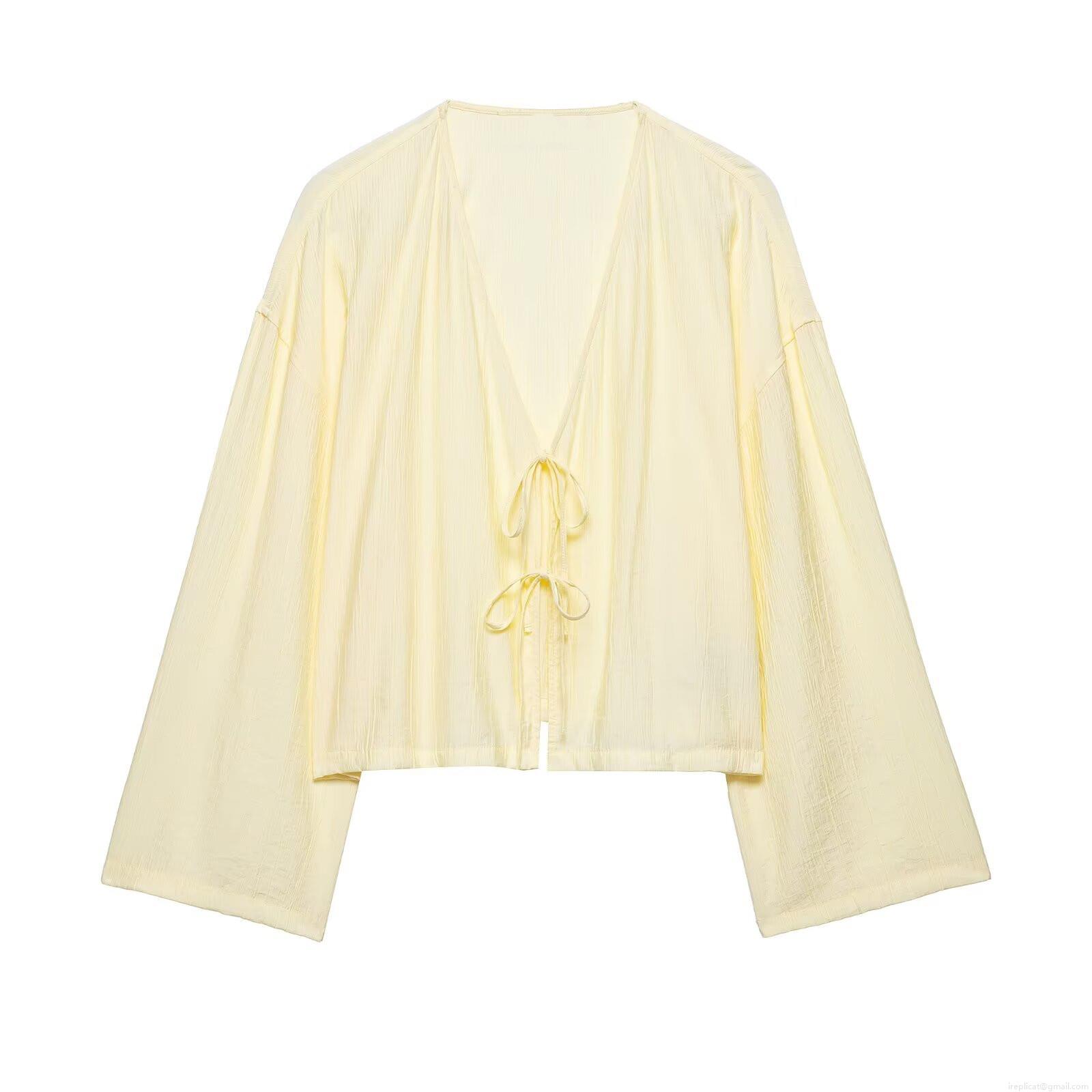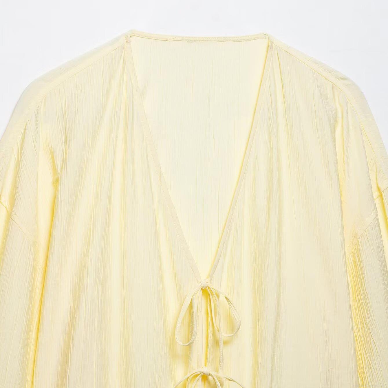 Solid Color, Bow, V-neck, Lace-up Design, Wrinkled Texture