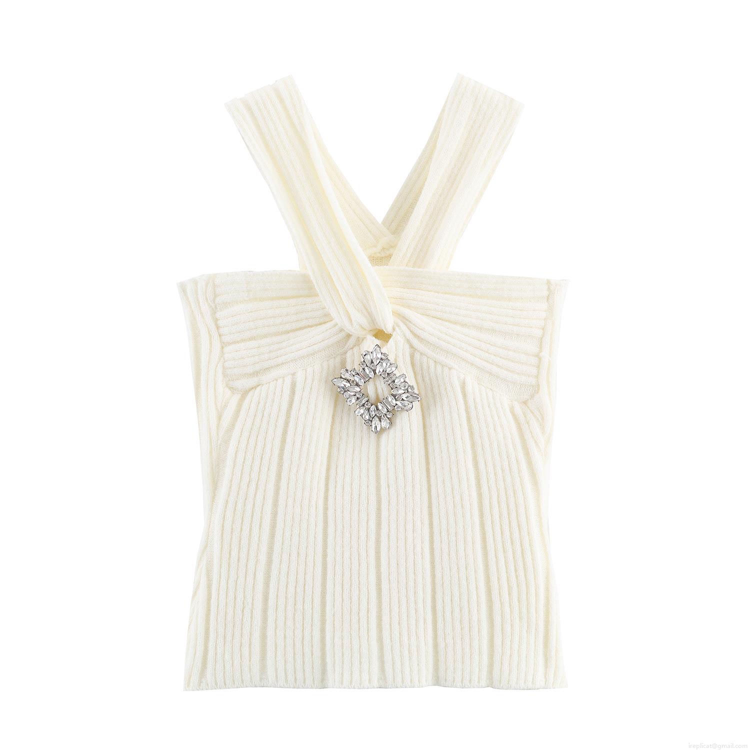 Solid Color, Ribbed Knit, Rhinestone Decoration, Rough Texture, Cross-neck