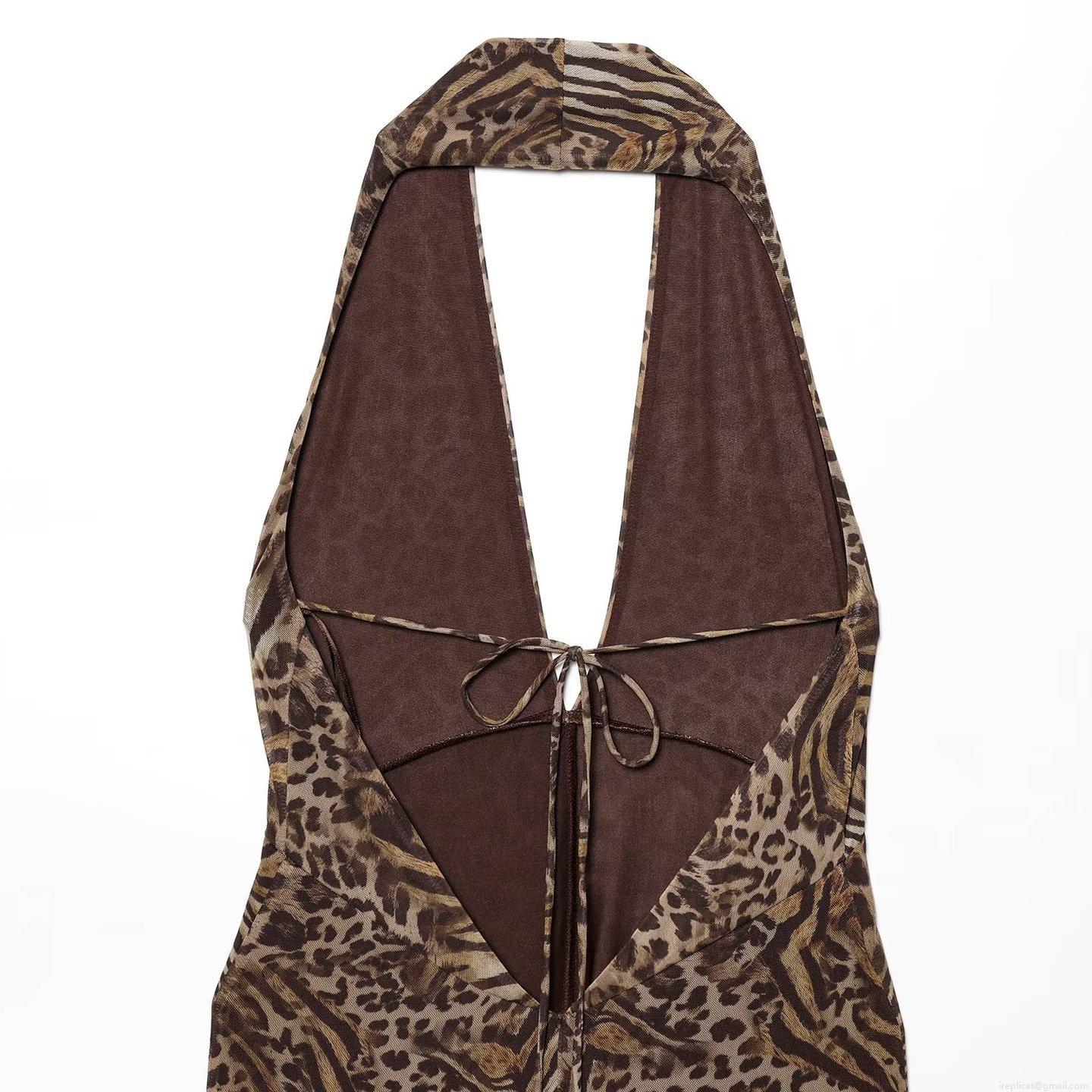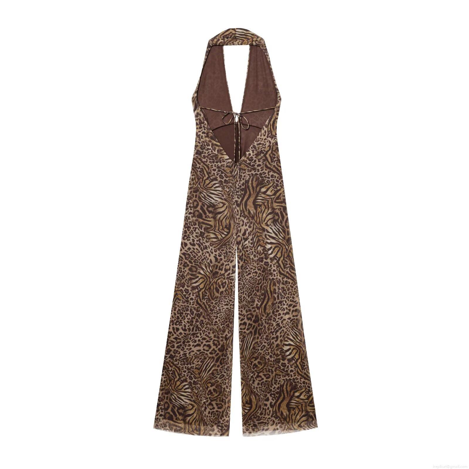 Leopard Print, Animal Print, Printing, Backless, Wide-leg, Deep V, Halter Neck Collar