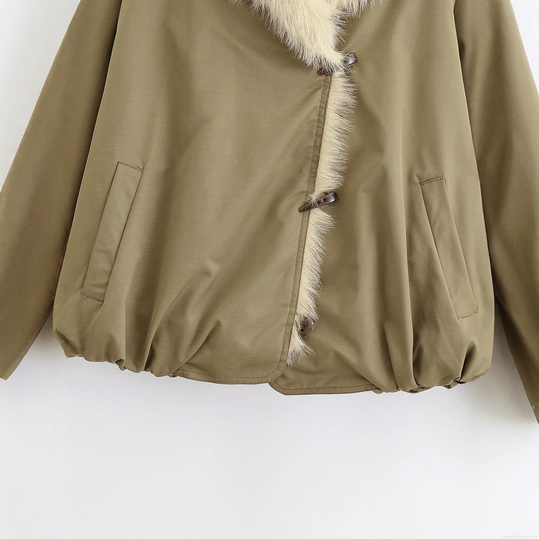 Solid Color, Lantern Sleeves, Twill Fabric, Horn Button, Large Fur Collar