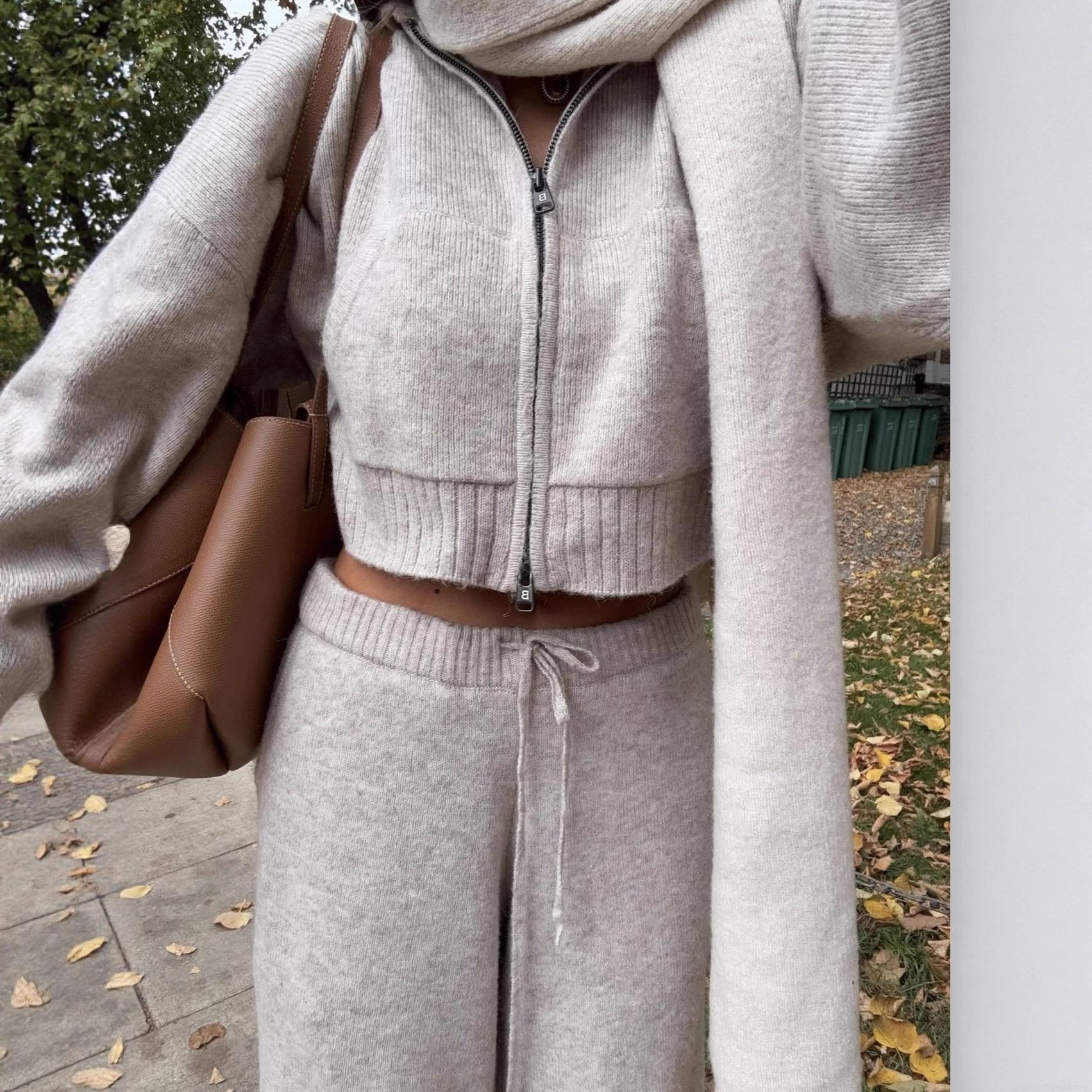 Solid Color, Zipper, Hood, Knitted Texture, Wide-leg Design