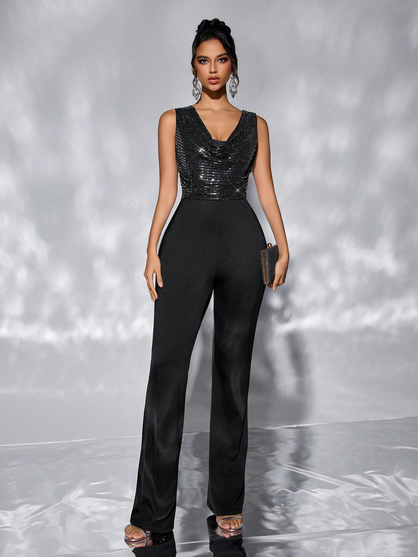 Solid Color, Sequin, Waist shaping, Sleeveless, Wide-leg, Deep V-neck