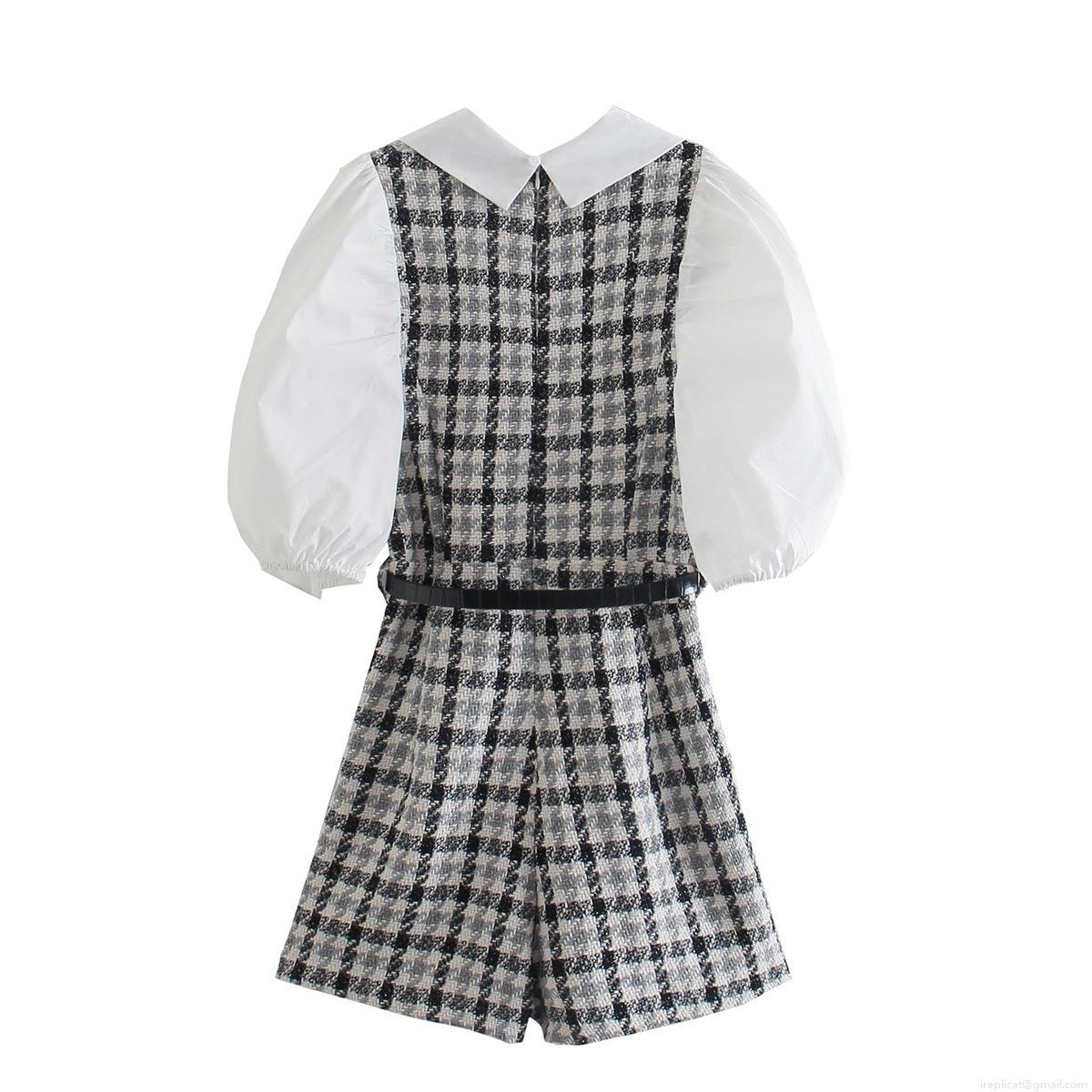 Splice, Color Blocking, Checkered Pattern, Collage, Peter Pan's Leader, Puff Sleeves, With Belt