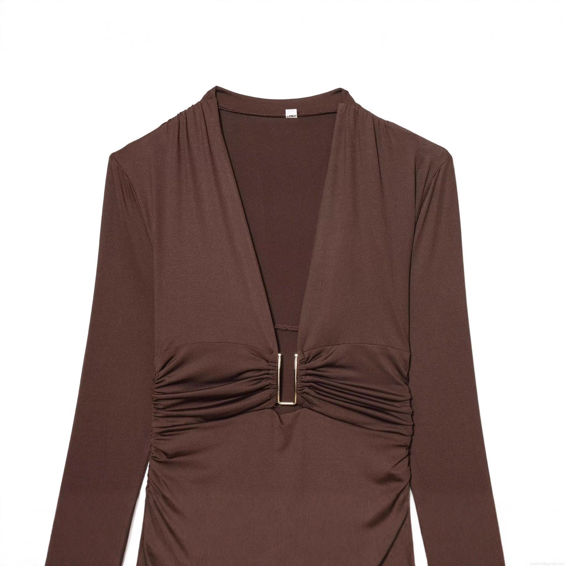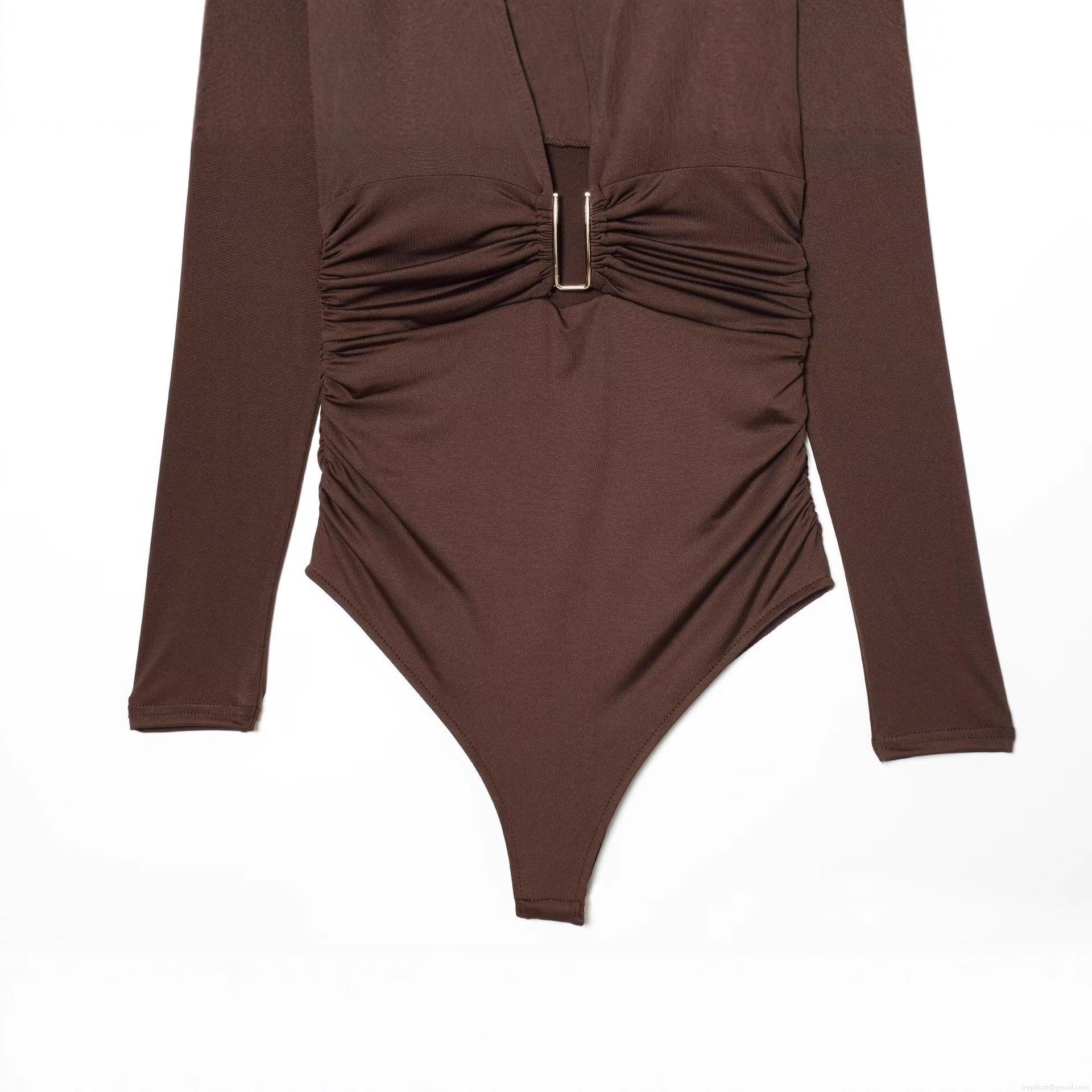Solid Color, Pleated Decoration, Deep V-neck, Gold U-shaped Metal Buckle
