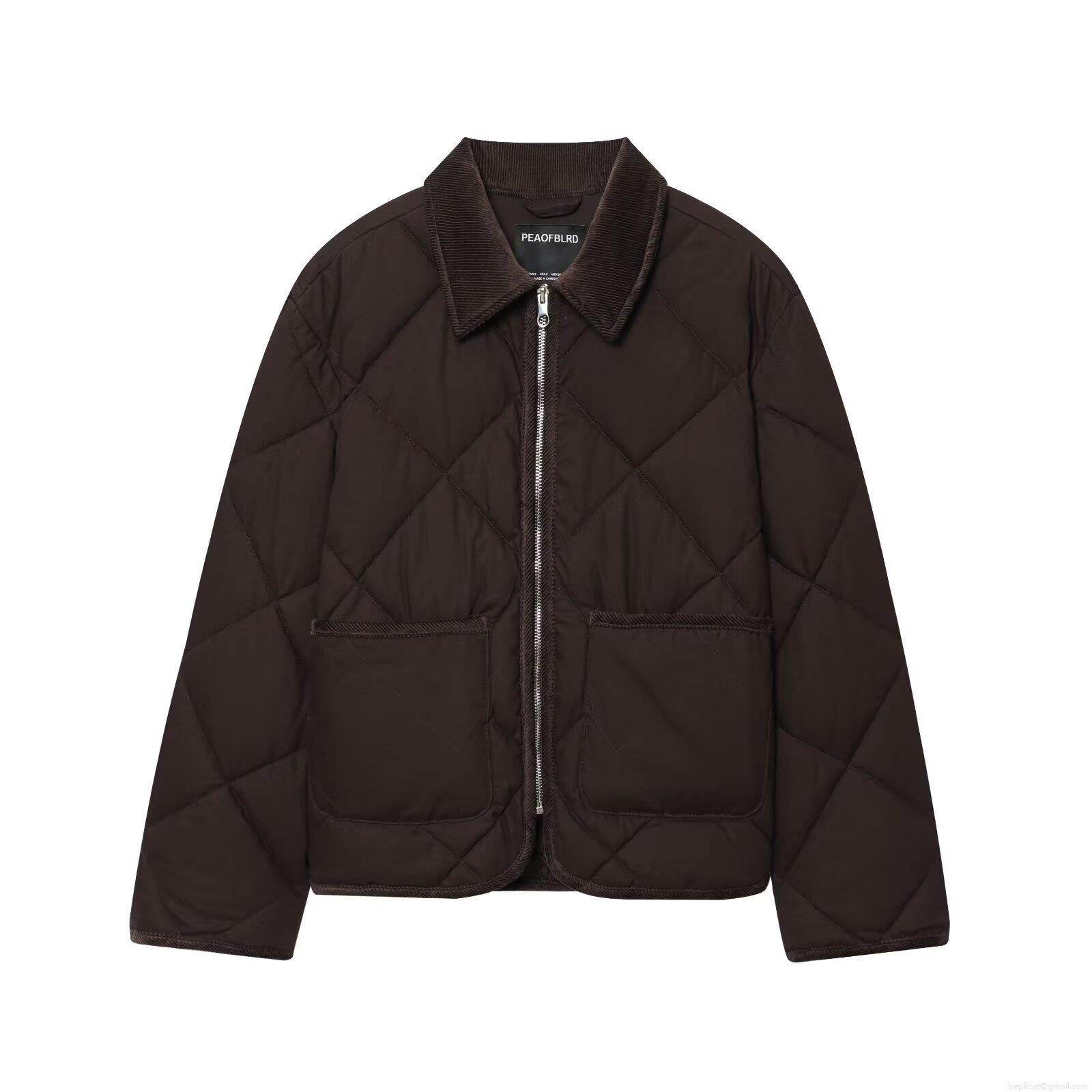 Solid Color, Diamond Pattern, Quilting, Metal Zipper, Appliqué Decoration, Corduroy Collar
