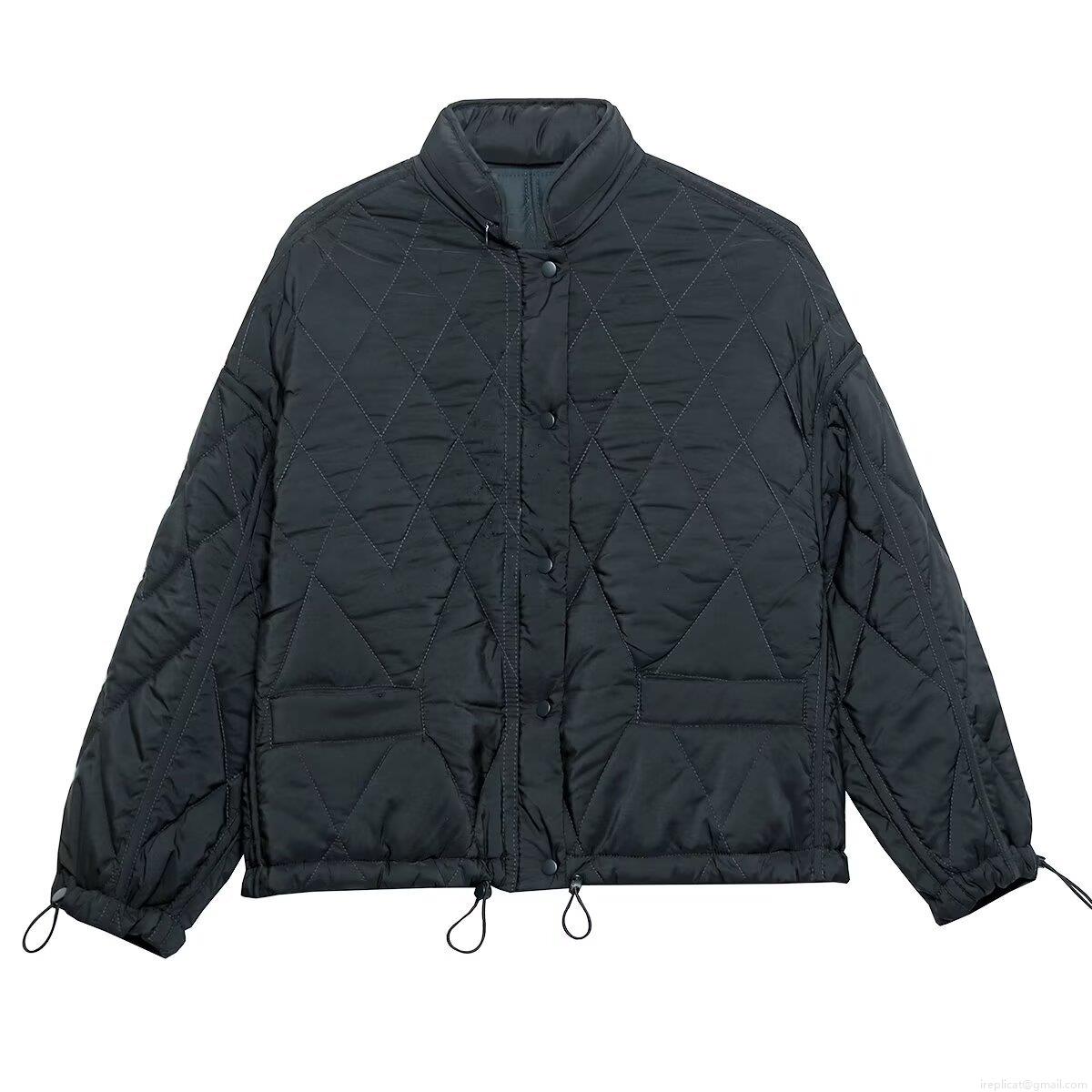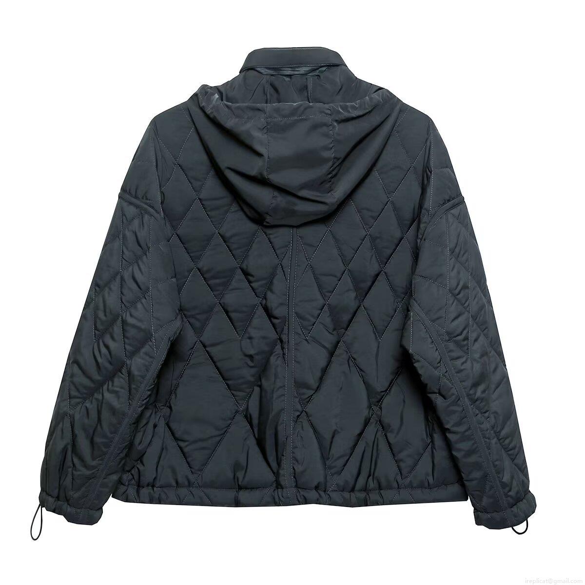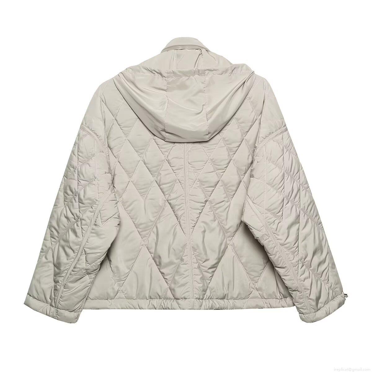 Solid Color, Zipper, Diamond Pattern, Metal Snap, Diamond Quilting, Drawstring At The Hem, Stand-up Collar Hood