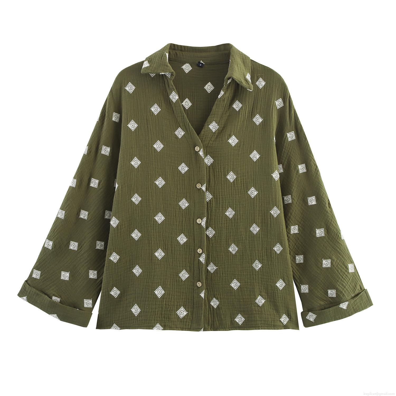 Embroidery, Small White Floral Pattern, Geometric Rhombus, Drawstring, Lapel, Button, Wrinkled Texture